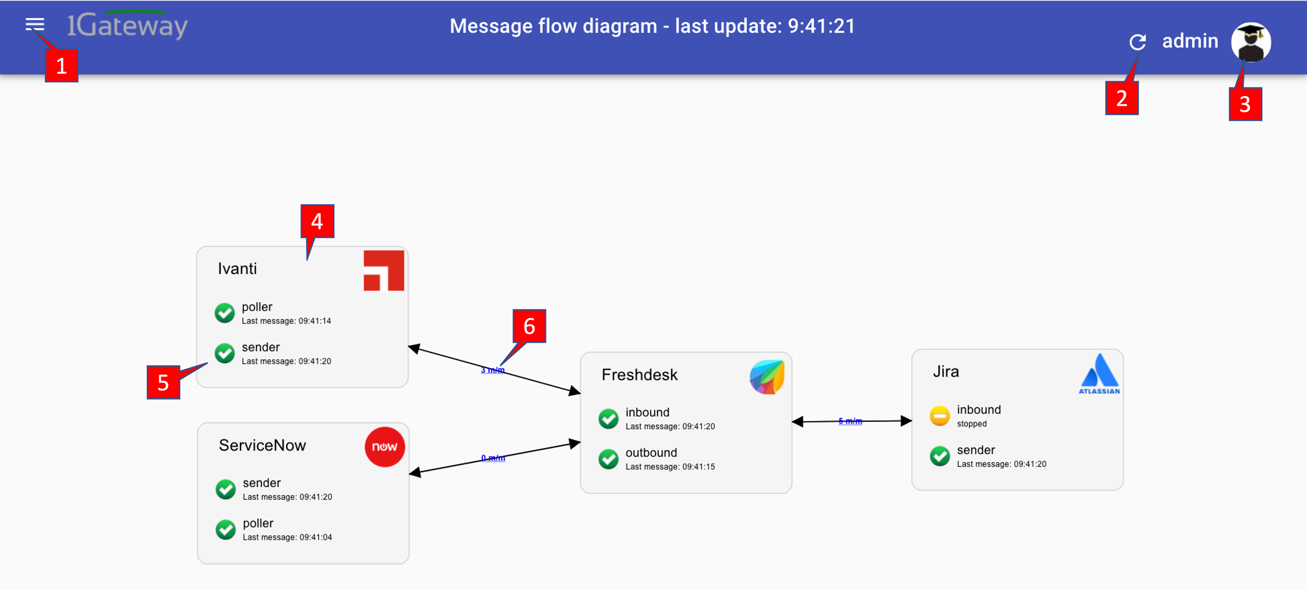 After the login you automatically get to the plugin diagram page. It shows the plugin status and statistics for the running plugins. Plugins are automatically grouped by endpoint, which currently defaults to the first word of the plugin name. The groups can be organised on the canvas by dragging them into the desired position. Right-click on a plugin brings up the context menu. Clicking on a connection (arrow between groups) brings up the detailed message flow.