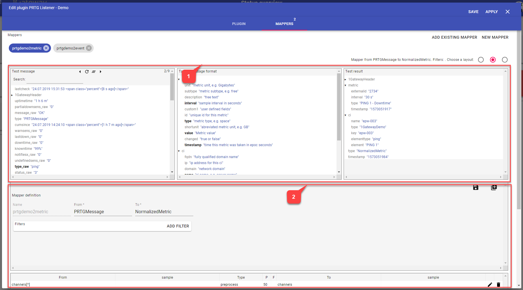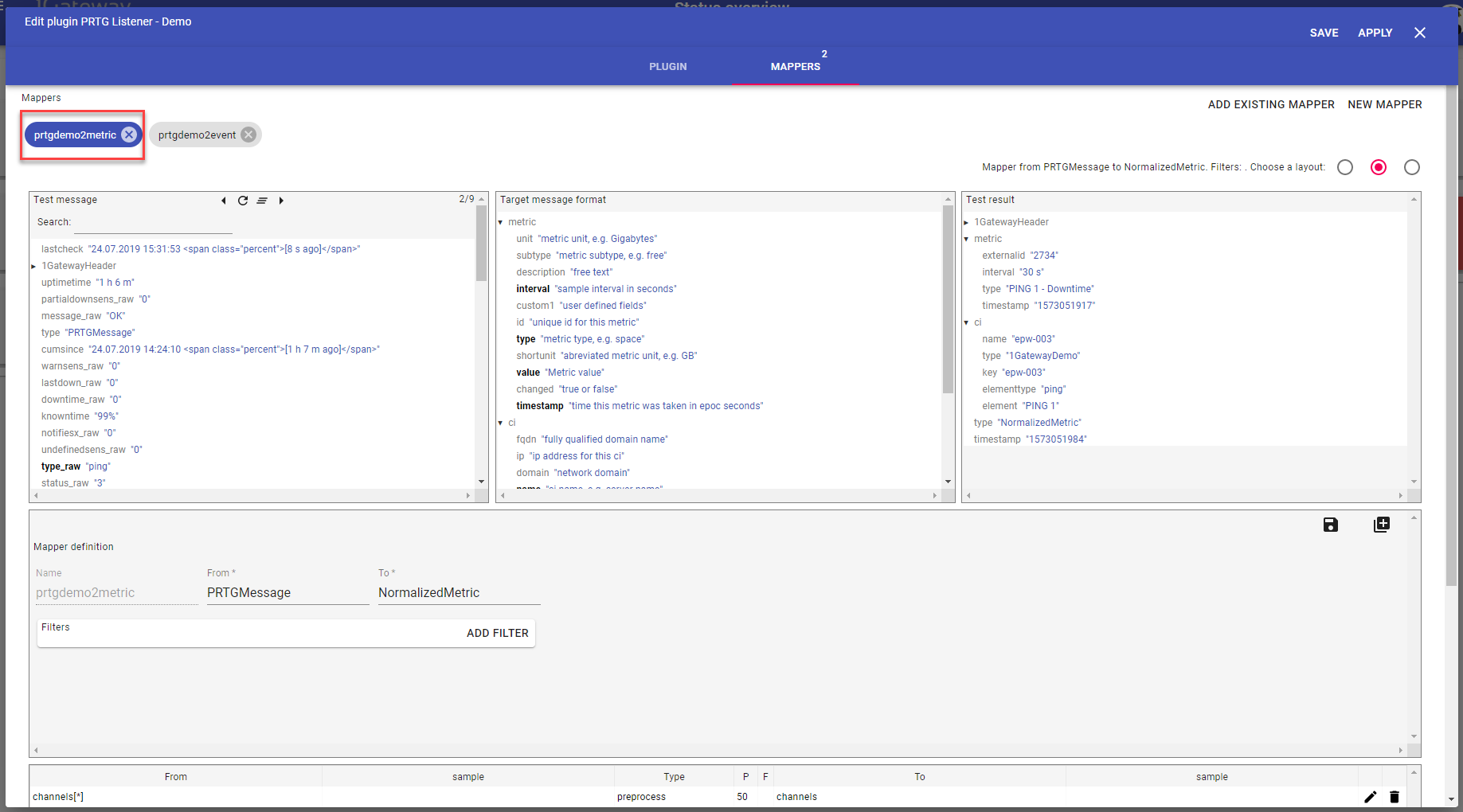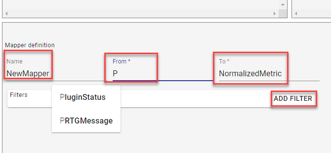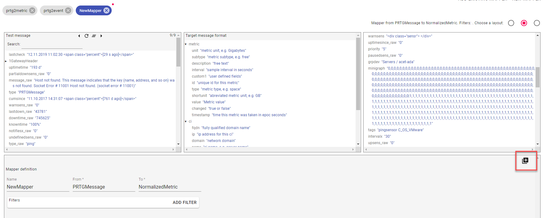 Give the new mapper a name and define input message format and output message format. Applying filters is possible to select specific messages within the Source message format.