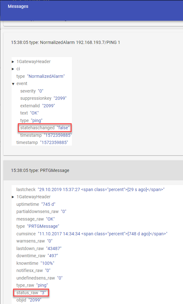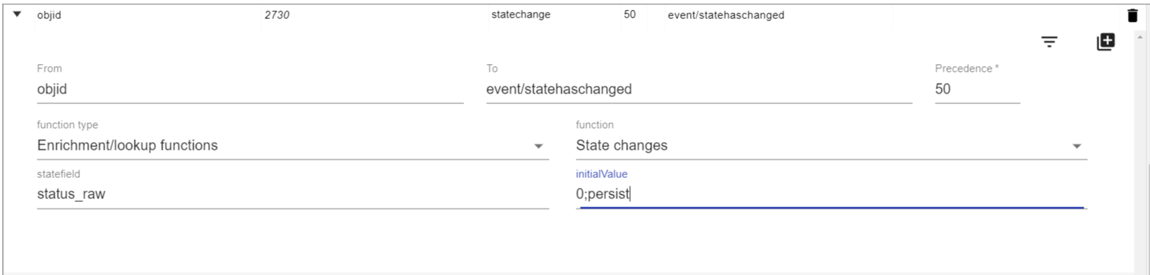 In the following example, the field status_raw is tracked. If the value of the field changes from one metric to another (for the same ci), a field with "statehaschanged": "true" is added and "statehaschanged": "false" otherwise.