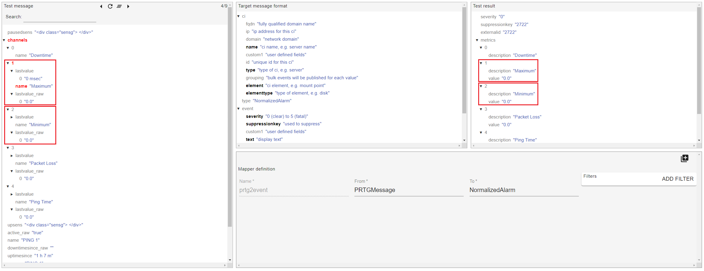 The translations between the Test Message field and the Test result field are highlighted in red.