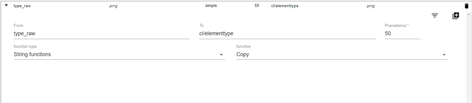 The copy function mapping defines a simple conversion of the field. It has a “from” field and a “to” field that define a field name translation, leaving the value unchanged. The mapping types are defined with “function type” and "function" attributes in the mapping. The default string function is "Copy".