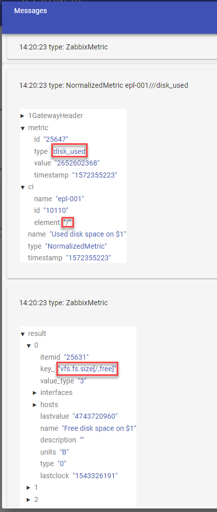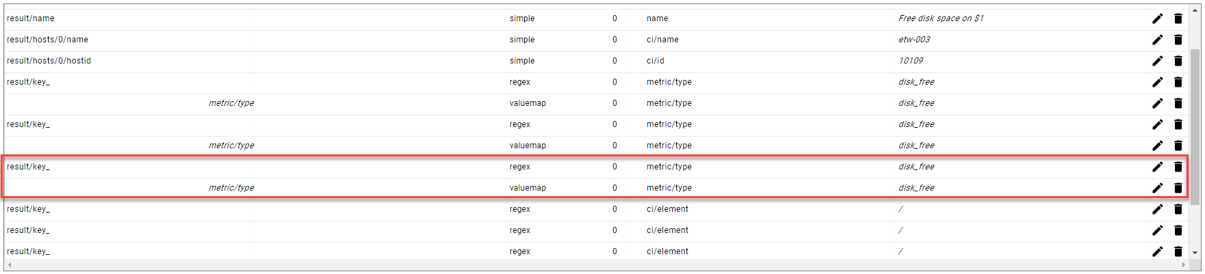 In this example the result/key_ field is parsed to extract the slash "/" and insert it into the ci/element field of the normalized message and to extract the rest "vfs.fs.size.free" and insert it into the metric/type field. Then the lookup table is applied, converting the value from "vfs.fs.size.free" to "disk_free".