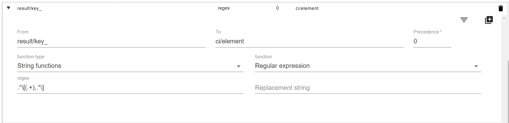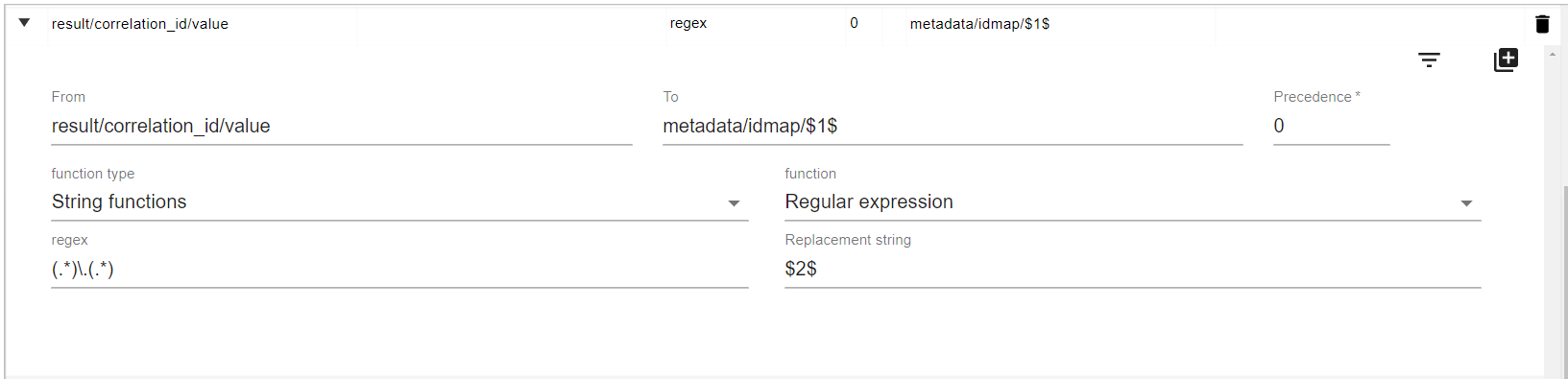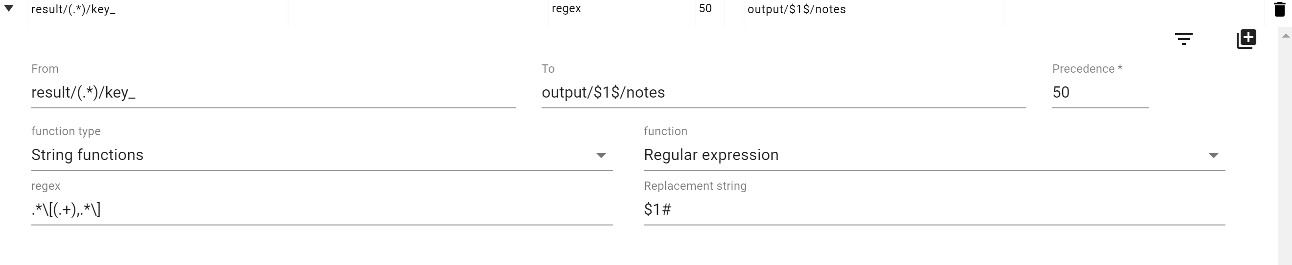 The regular expression (regex) mapping is similar to a lookup table mapping but uses regular expressions to define the replacement rules. To define a regex mapping the Function type needs to be set to "String functions" and the function needs to be set to "regular expression". The attributes that need to be set in a regex mapping are: