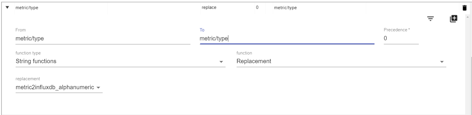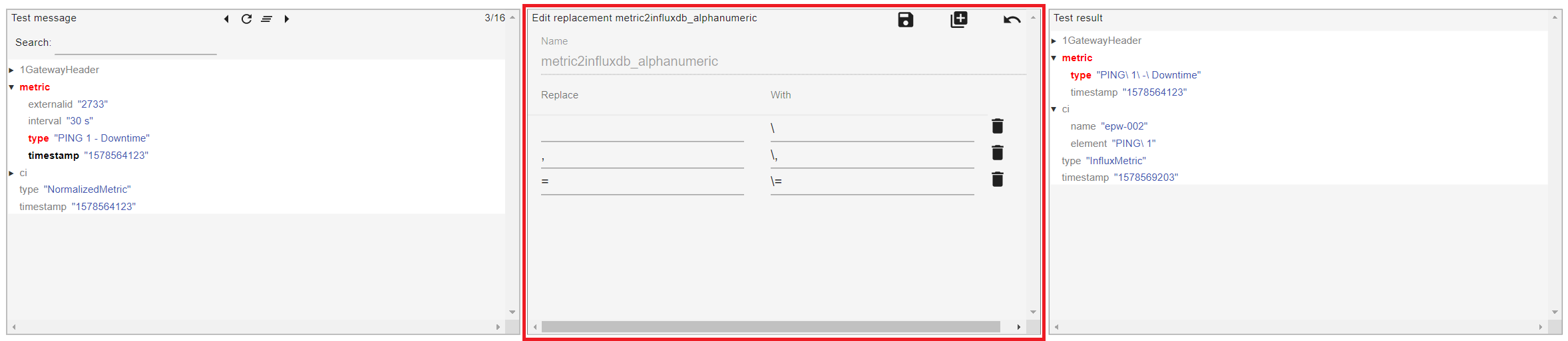 In this example, the metric2influx_alphanumeric replacement is used to replace the special characters found in the field value that InfluxDB can't process. In this case, these characters are escaped with a backslash "\".
