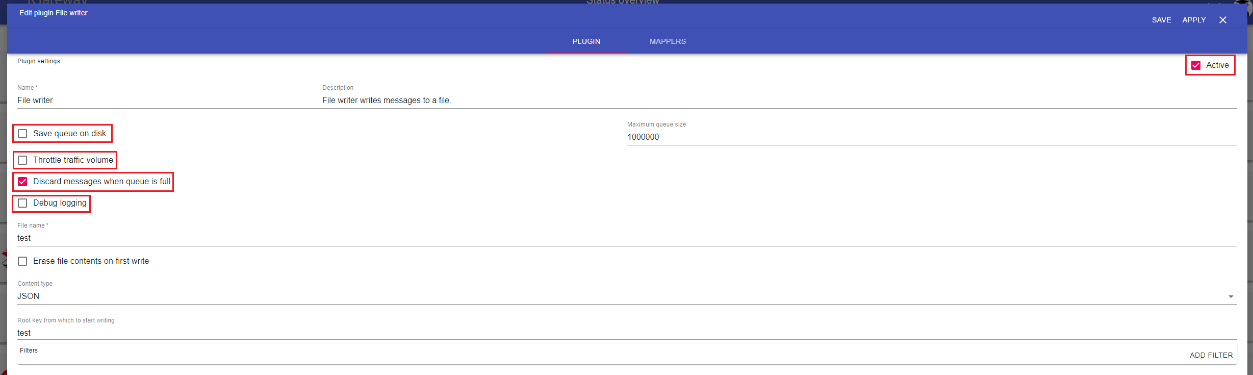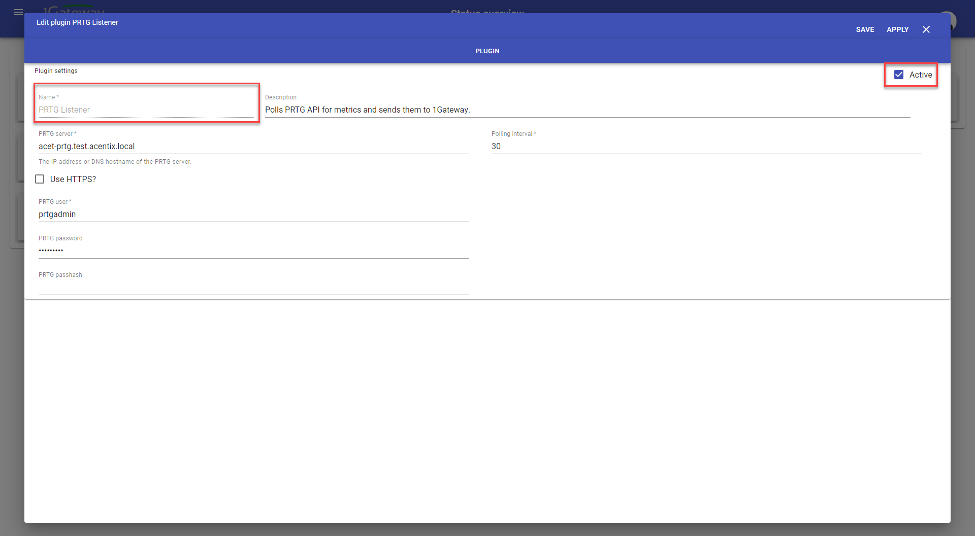 - Active: indicates whether to activate the plugin on 1Gateway startup or not. If it's not checked, the plugin will need to be started manually after startup.