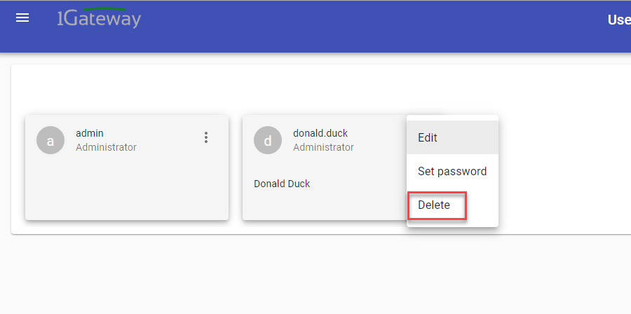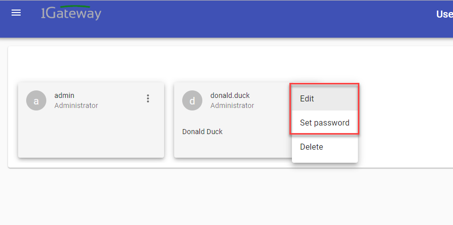 In the "User Administration" Menu you can manage 1Gateway Users. You can create users, edit users and delete users.