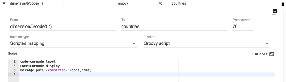 When you define a mapping with a regular expression and a capture group in the “from” field, the mapping will be executed once for each matching result, automatically iterating over the result set. In the mapping itself, the content of the current branch (the part of the message referenced by the matching from field) is made available as “curnode”. In this example, we basically add a country code lookup table to the message.
