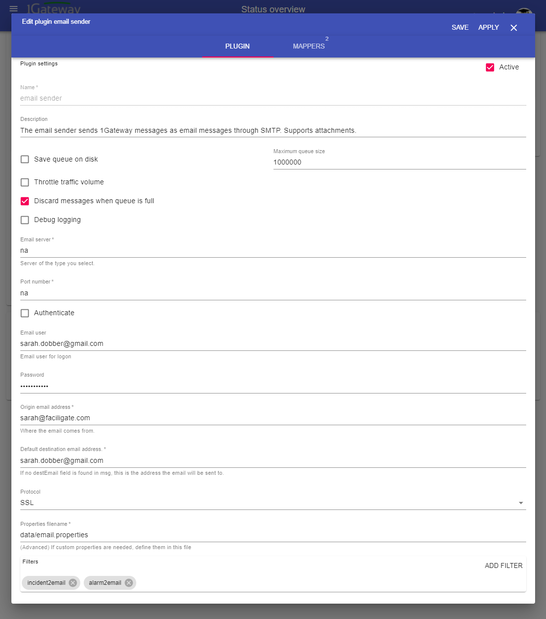 The email sender sends 1Gateway messages as email messages through SMTP. Supports attachments.