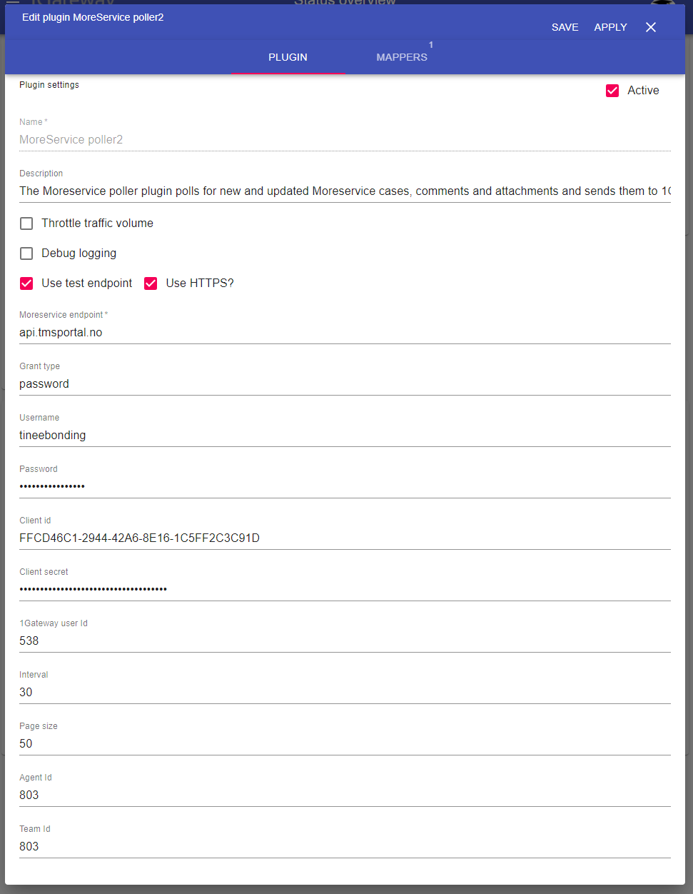 | Team id | Any string | Id of the 1Gateway Team in Moreservice. Leave blank if polling for all teams |