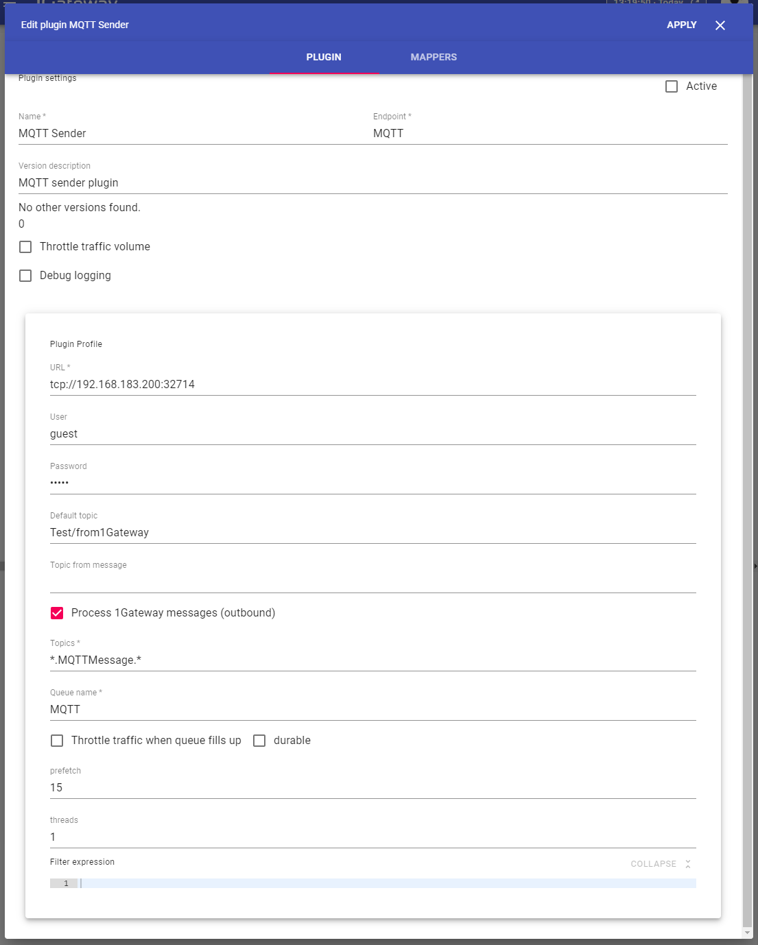| Process 1Gateway messages (outboud) | Tickbox | If unticked, the plugin doesn't get any messages |