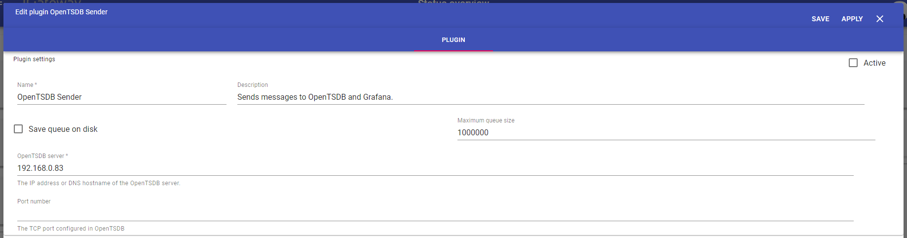 The OpenTSDB sender sends metrics from 1Gateway into a OpenTSDB. If configured, OpenTSDB sends the messages it receives to Grafana.