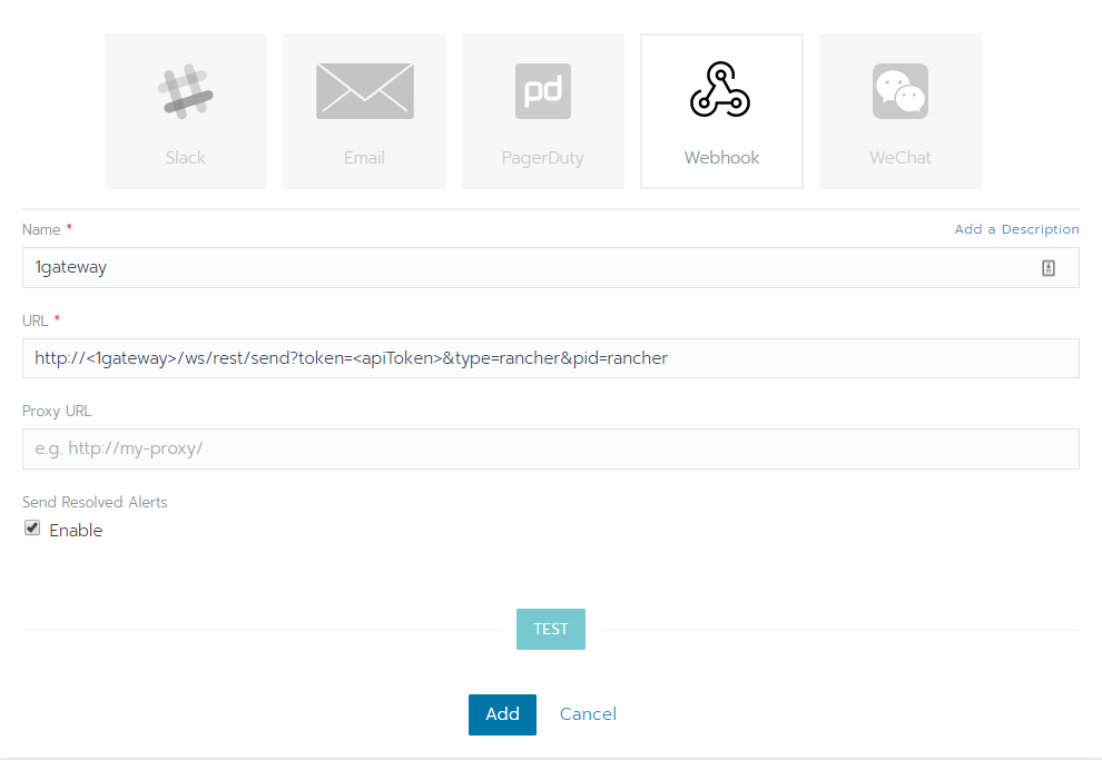 Login to Rancher and add a new webhook notifier, give a name, set the URL (replace <1gateway> and <apiToken> with your 1gateway information) and enable "Send Resolved Alerts".