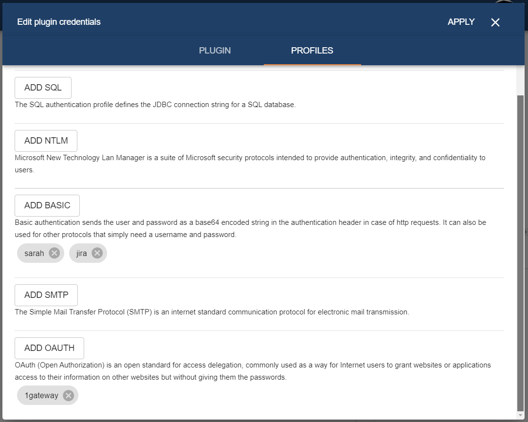 To configure the credentials for a plugin, go to the main menu and select credentials. Click on the profiles tab and select the type of credentials to configure.