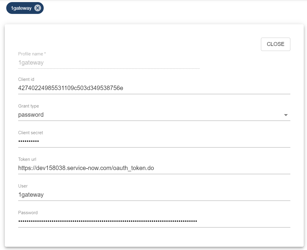 - Basic Authentication: for Servicenow instances configured with Basic Authentication, click on the ADD BASIC button and configure the 1Gateway username and password.