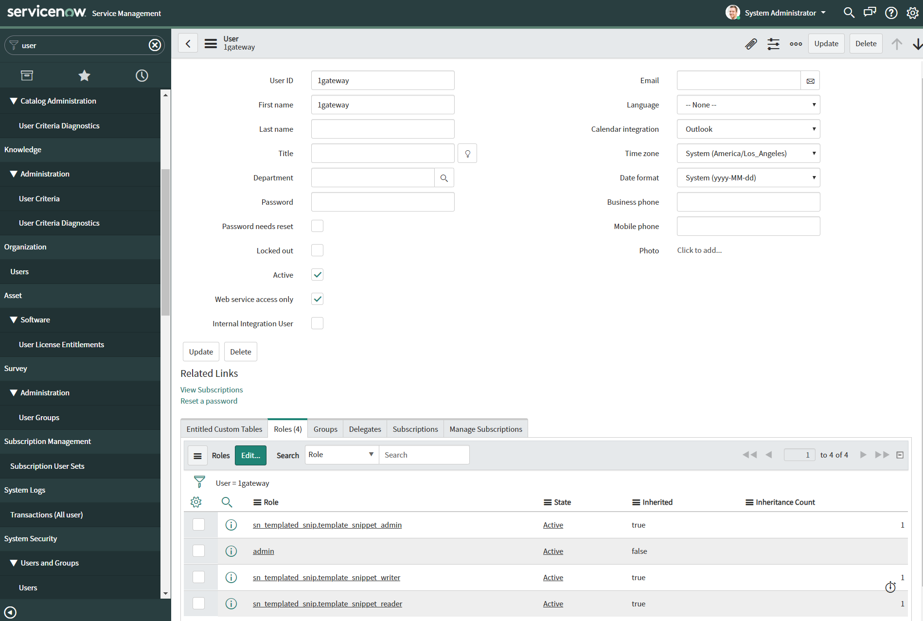 To add a new user in ServiceNow, go to Organization > Users and click New. Fill out the User ID (username) and password and tick the "Active and Web service access only" checkbox. Finally, give the user admin role.