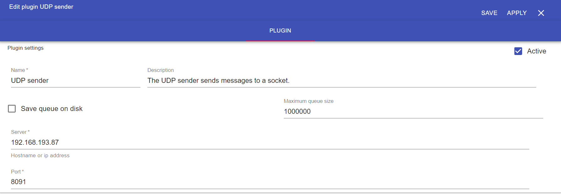 The UDP sender plugins sends messages from 1Gateway to a socket.